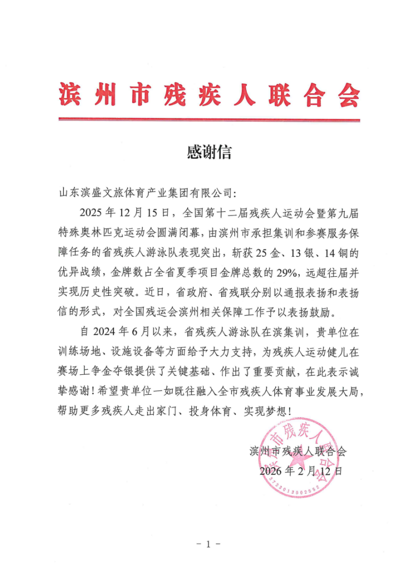 近日,滨州市残疾人联合会致信山东滨盛文旅体育产业集团,对滨州市全民健身中心游泳馆为备战全国第十二届残疾人运动会的省残疾人游泳队集训期间提供的专业保障与优质服务表示衷心感谢。该场馆具备省级乙级赛事承办标准,此次获赞既是对场馆服务能力的高度肯定,也充分印证了其作为省级赛事重要承载地的综合实力。