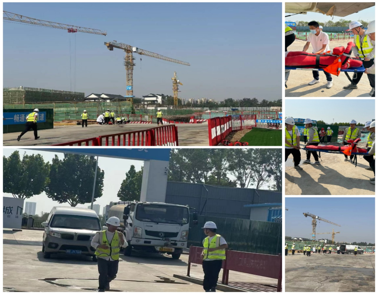 本次演练模拟了在建工程楼层施工人员高处坠落的场景。随着警报声响起,应急救援小组成员(救援、疏导、联络、警戒)迅速反应,有序警戒事发区域,对伤者进行有效处理,及时联络救援车辆,组织就医,快速进行救援。